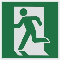 Назначение:Над дверями (или на дверях) эвакуационных выходов, открывающихся с левой стороны. На стенах помещений вместе с направляющей стрелкой для указания направления движения к эвакуационному выходу