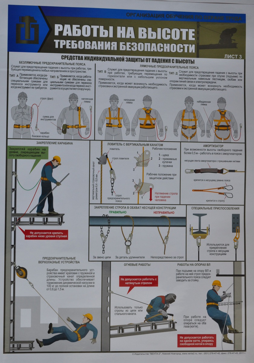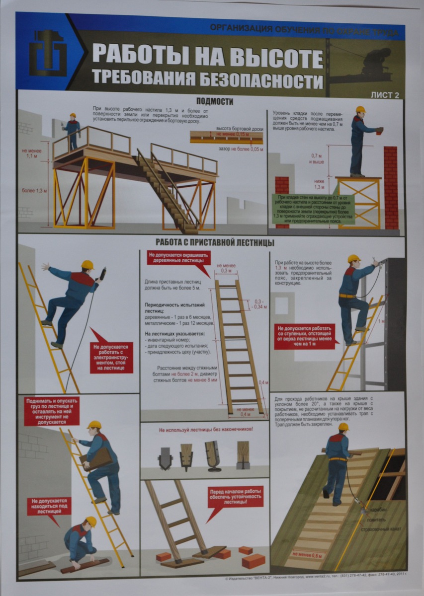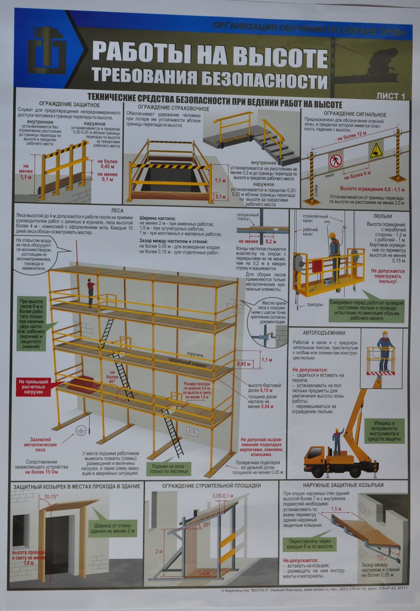 Описываются технические средства безопасности при ведении работ на высоте, установка лесов и ограждений, работа с автоподъемников и люлек, работа с подмостей и лестниц, средства индивидуальной защиты от падения, предохранительные верхолазные устройства.