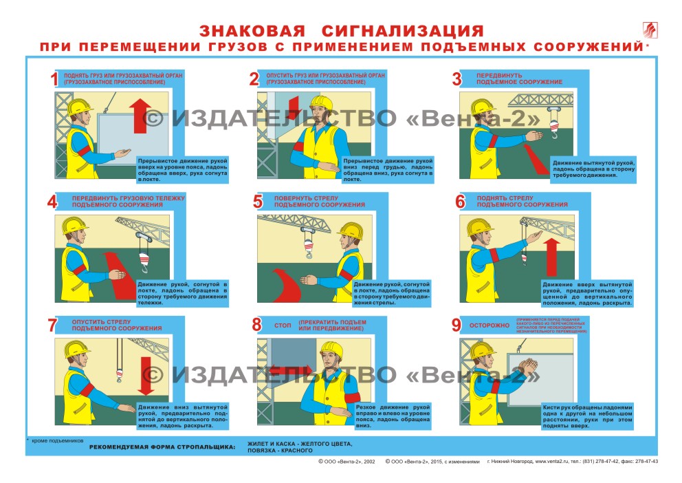На плакате изображена знаковая сигнализация, применяемая при перемещении грузов подъемными сооружениями.