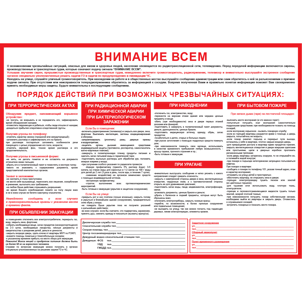 Лист 1 - Действия при террористических актах, при наводнении, при бытовом пожаре, при урагане, при объявлении эвакуации, при радиоактивной, химической, бактериологической авариях.