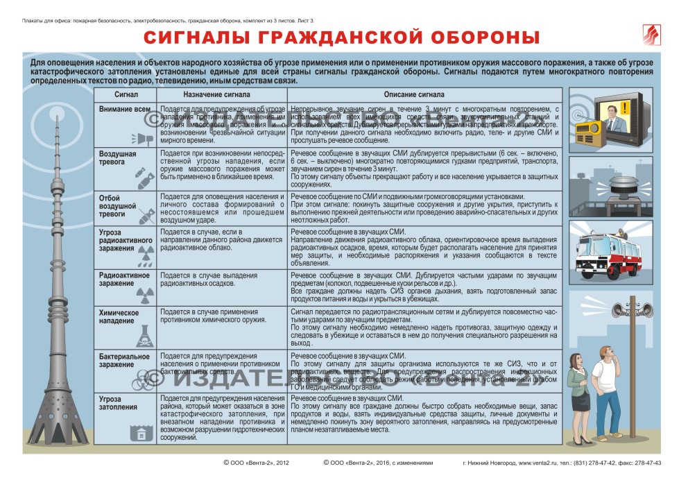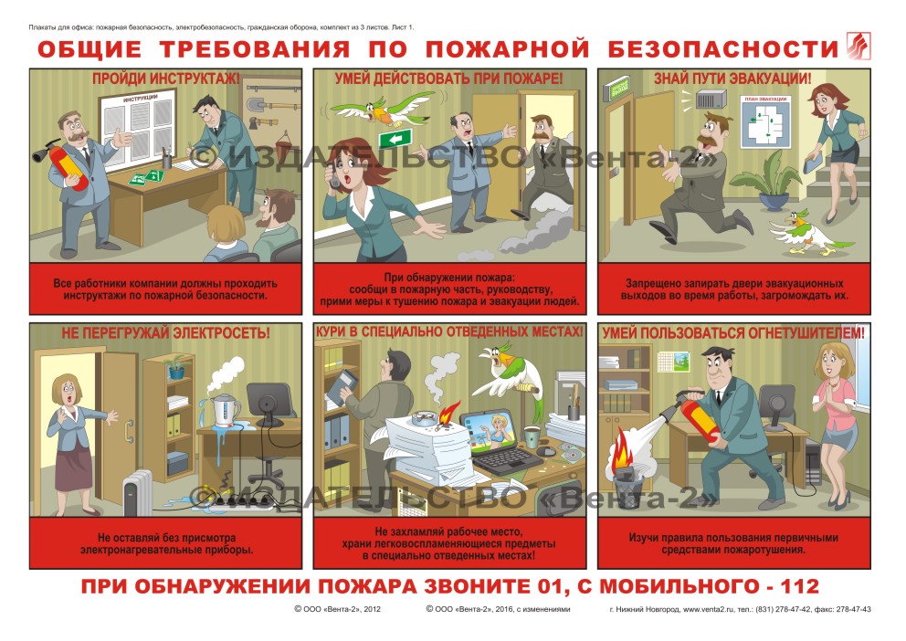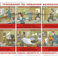 Комплект плакатов для офиса: пожарная безопасность, электробезопасность, гражданская оборона. Описывает общие требования электро- и пожаробезопасности в офисе, разъясняет значение сигналов гражданской обороны и действия населения при их звучании.