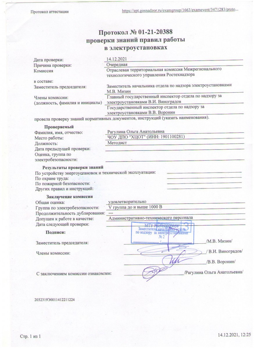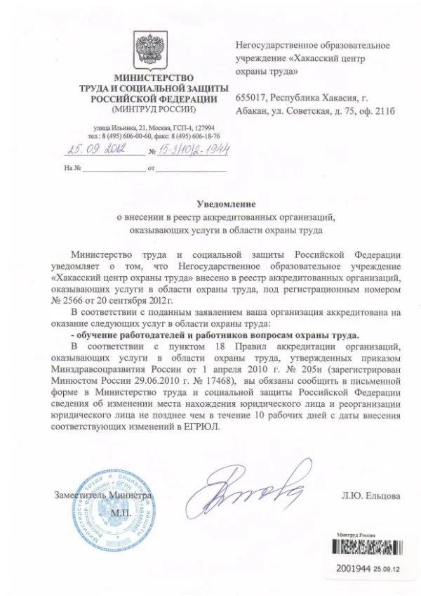 Уведомление о внесении в реестр аккредитованных организаций, оказывающих услуги в сфере охраны труда