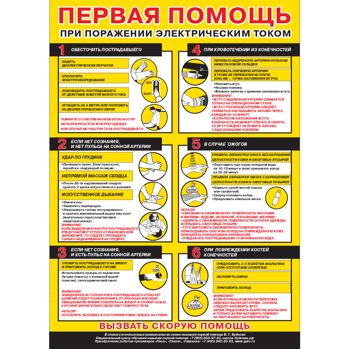 Плакат "Первая помощь при поражении электрическим током" содержит приемы оказания первой помощи при электротравмах.