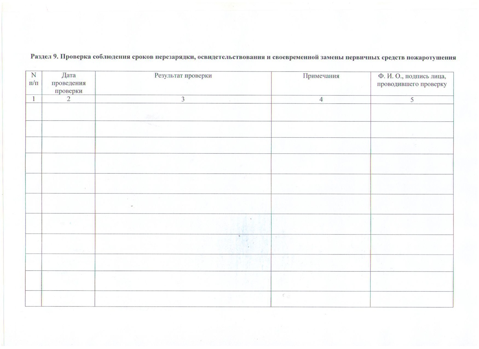 Раздел 9. Проверка соблюдения сроков перезарядки, освидетельствования и своевременной замены первичных средств пожаротушения