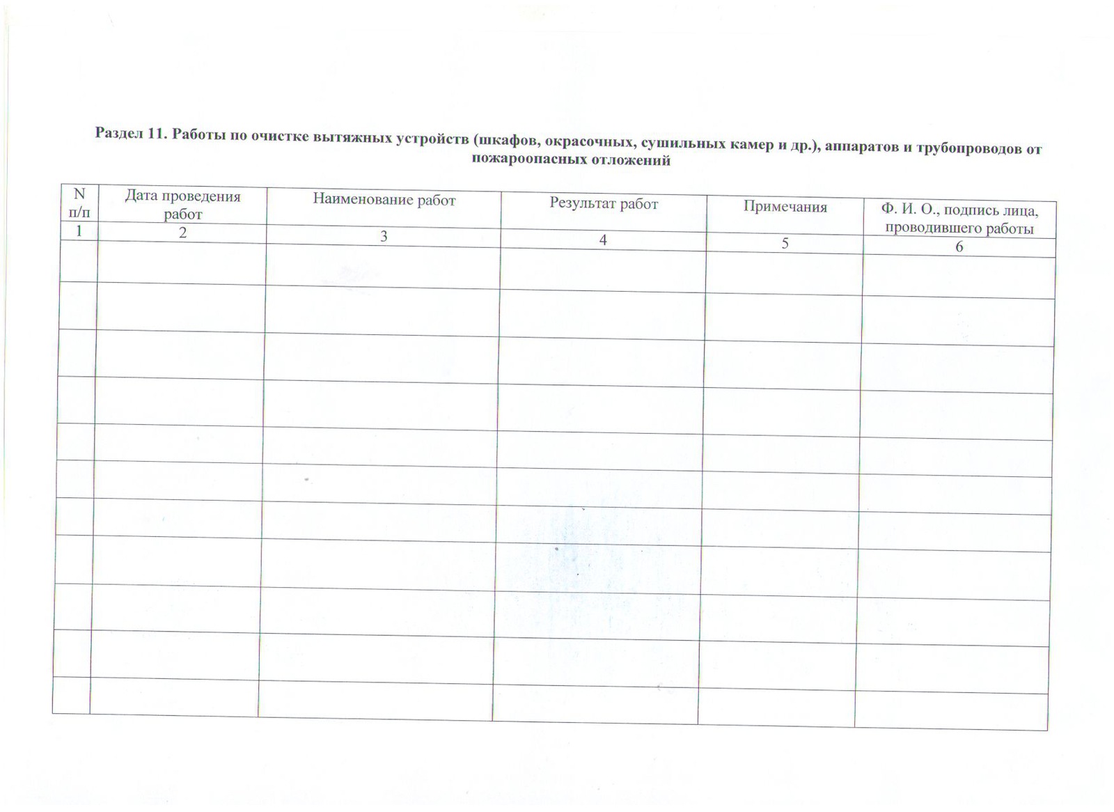 Раздел 11. Работы по очистке вытяжных устройств (шкафов, окрасочных, сушильных камер и др.), аппаратов и трубопроводов от пожароопасных отложений