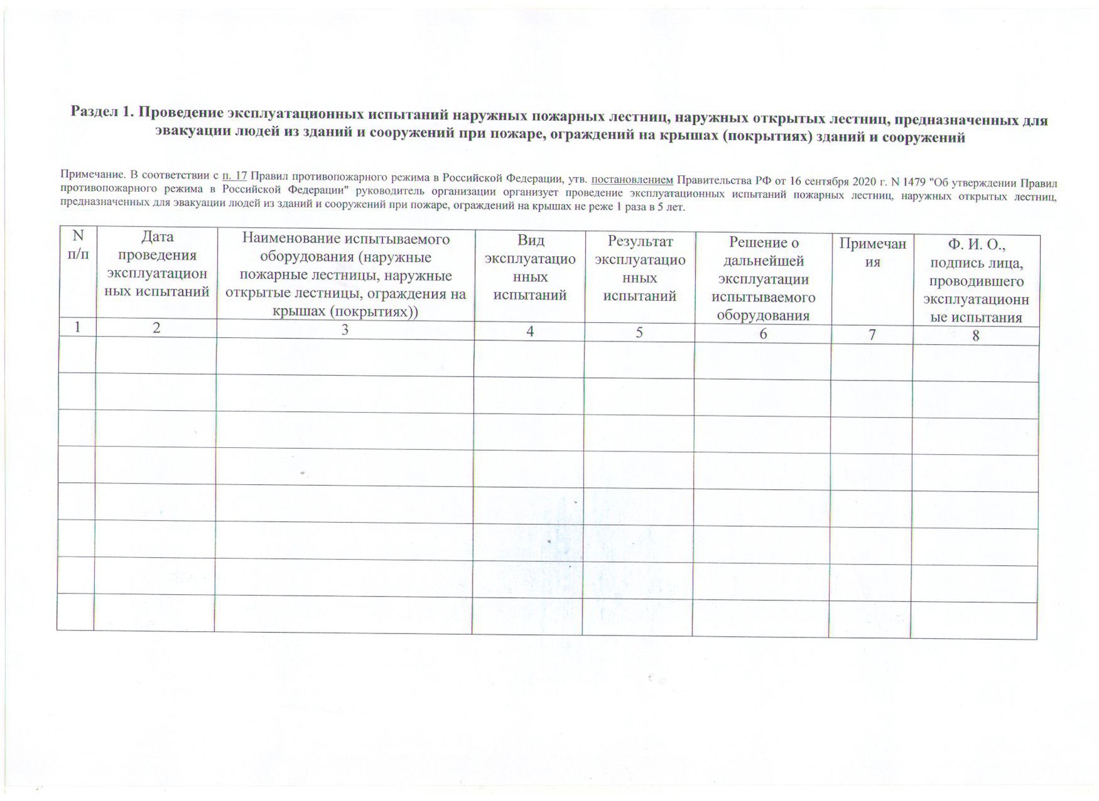 Раздел 1. Проведение эксплуатационных испытаний наружных пожарных лестниц, наружных открытых лестниц, предназначенных для эвакуации людей из зданий и сооружений при пожаре, ограждений на крышах (покрытиях) зданий и сооружений