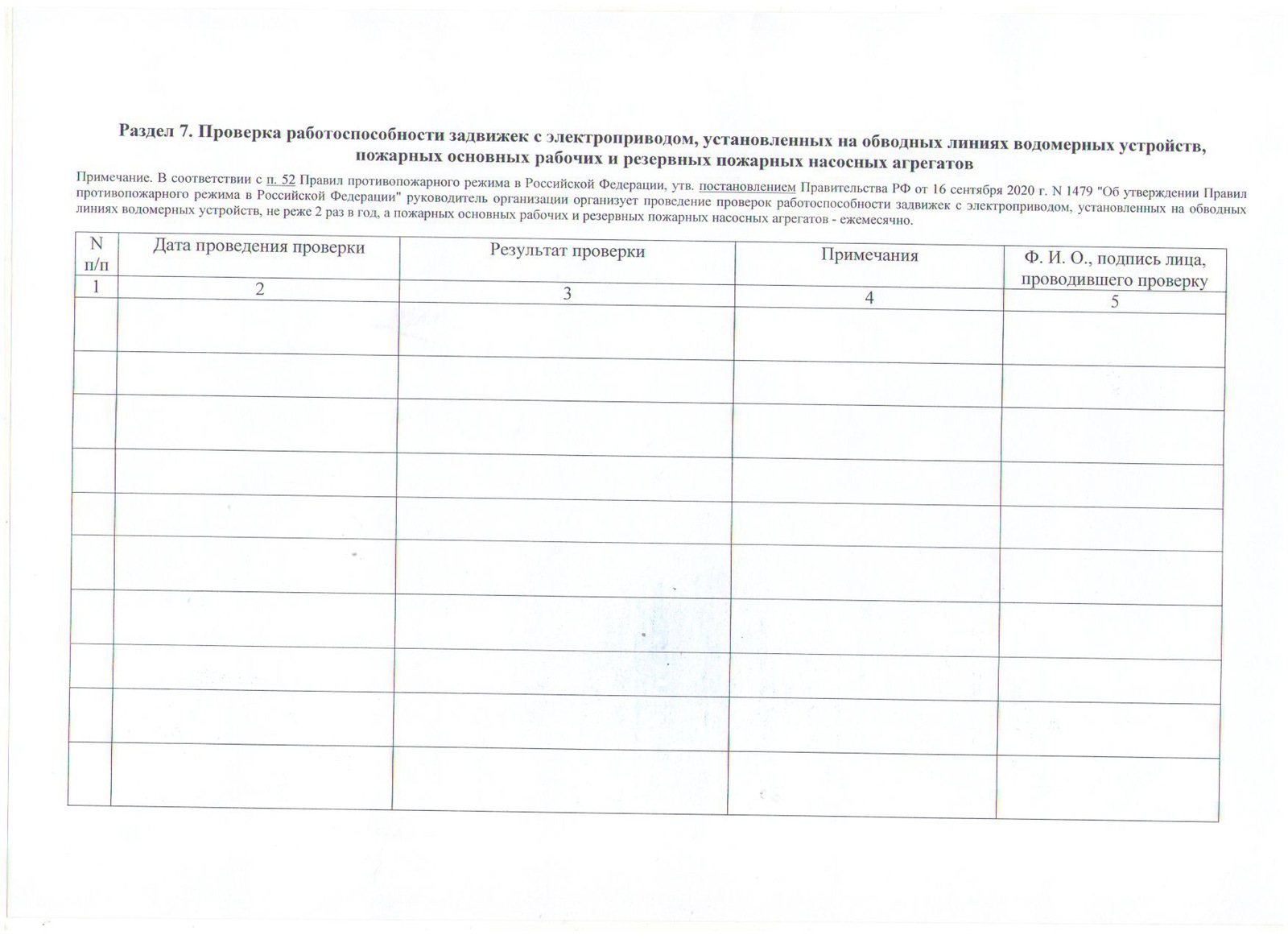 Раздел 7. Проверка работоспособности задвижек с электроприводом, установленных на обводных линиях водомерных устройств, пожарных основных рабочих и резервных пожарных насосных агрегатов
